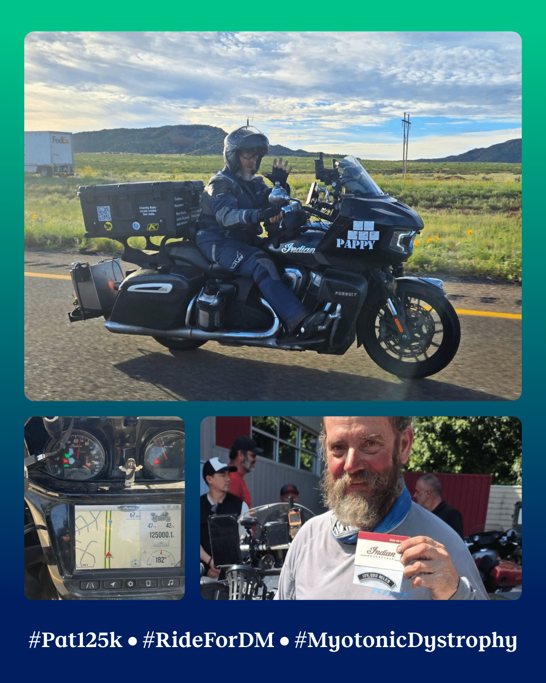 Even on his way home, Pat inadvertently logged another 1,000-mile day, bringing his total to 146,000 miles in 146 days. More importantly, his motorcycle ride for myotonic dystrophy awareness captured national attention, drawing in new supporters and uniting the community coast-to-coast.