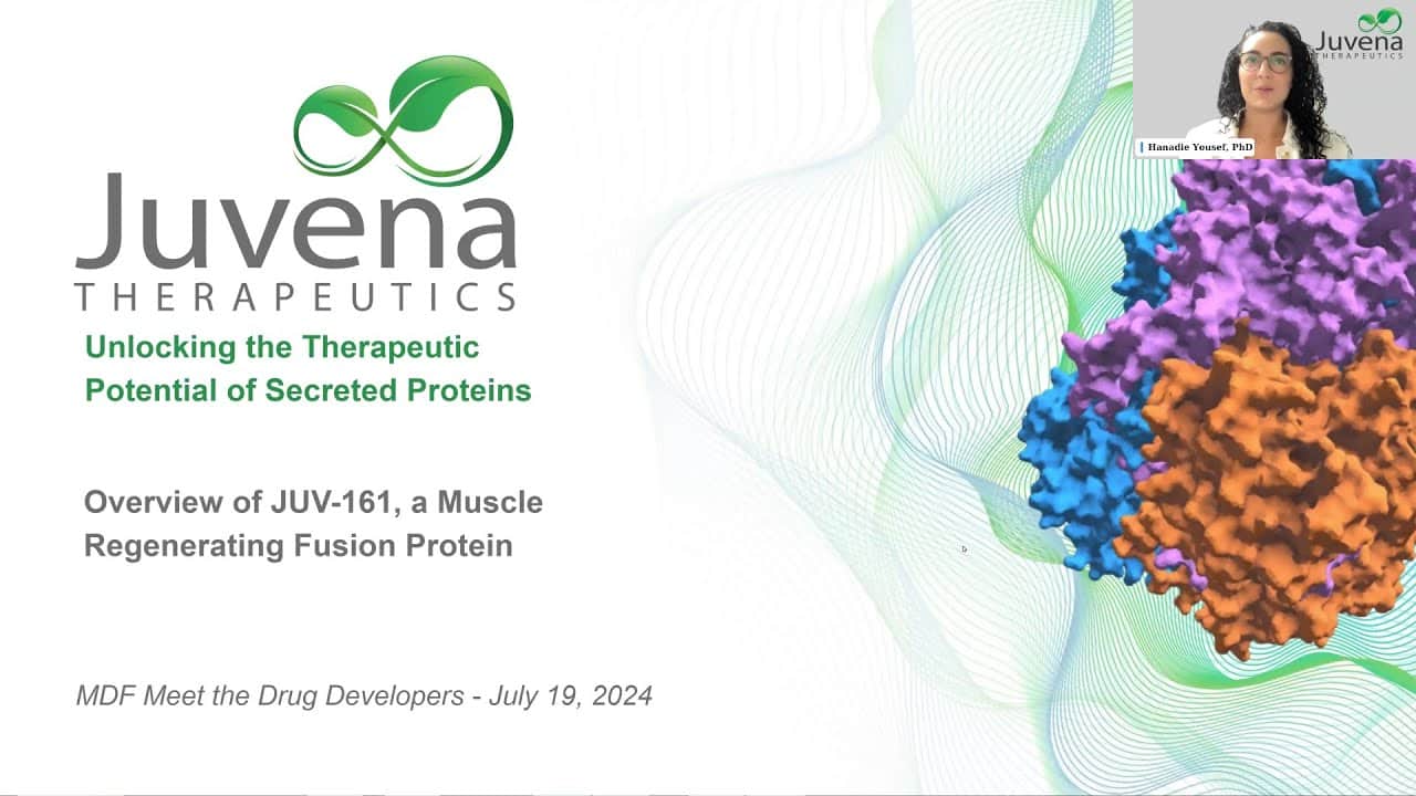 Juvena Therapeutics presents on their myotonic dystrophy program, focusing on JUV-161, a therapeutic protein that has demonstrated the ability to restore muscle differentiation, promote survival, increase strength, and improve metabolism by restoring protein signaling mechanisms that are crucial for muscular and metabolic homeostasis. Click here to learn more about Juvena Therapeutics.