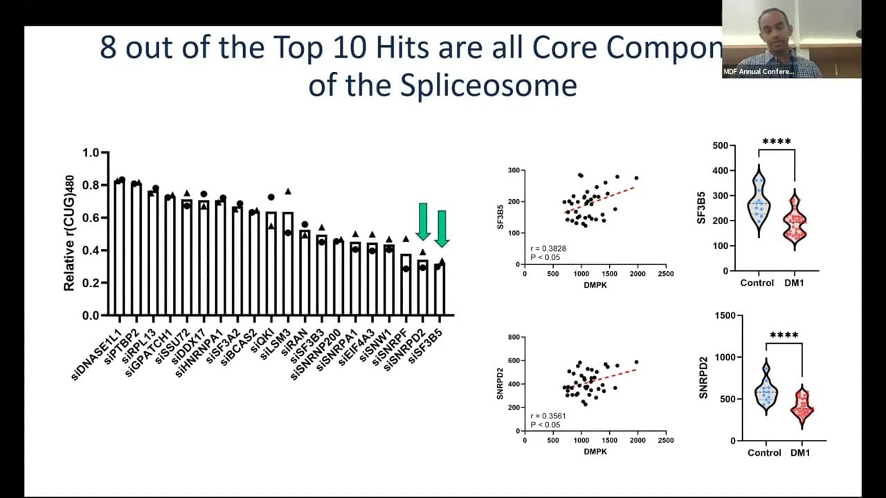 Myotonic dystrophy (DM) is caused by DNA repeat expansions that produce toxic repeat expansion RNA. These toxic RNA molecules gain a number of aberrant functions in the cell leading to disease. One major consequence is the sequestration of the MBNL family of RNA processing proteins. By acting as a molecular sponge to the MBNL proteins, toxic RNA production causes widespread RNA processing defects as a result. Thus, when considering development of therapeutic approaches, a cellular system where the toxic RNA abundance can be sensitively and rapidly measured on a large scale can permit screening of large numbers of chemical and biological agents with therapeutic potential. We previously developed a HeLa DM cell line that enables us to simultaneously measure the levels of a toxic RNA and a non-toxic control RNA to rapidly identify treatments that selectively affect the toxic RNA. We previously used this cellular screening system to identify new candidate small molecule therapeutics for DM. We are now expanding our approach to screen the human genome for genetic modifiers of toxic RNA levels in DM. Through genetic screening, we identified new splicing factors that modulate toxic RNA effects in DM patient cells. Identifying genetic modifiers of toxic RNA in DM provides new biological and therapeutic insights and may shed light on new disease modifiers for DM that can help to explain the considerable disease heterogeneity in patients.